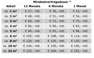 Vermietet werden mehrere Lagerboxen von 1m² bis 22m² ab 1 Monat Mietzeit.