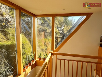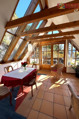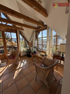 Besonderes Highlight ist der großzügige Wintergarten, der durch seine Architektur und Helligkeit besticht – ein Raum, in dem die Jahreszeiten zum Erlebnis werden. Von hier aus gelangt man auf den Balkon, der einen herrlichen Blick in die umliegende Natur bietet.